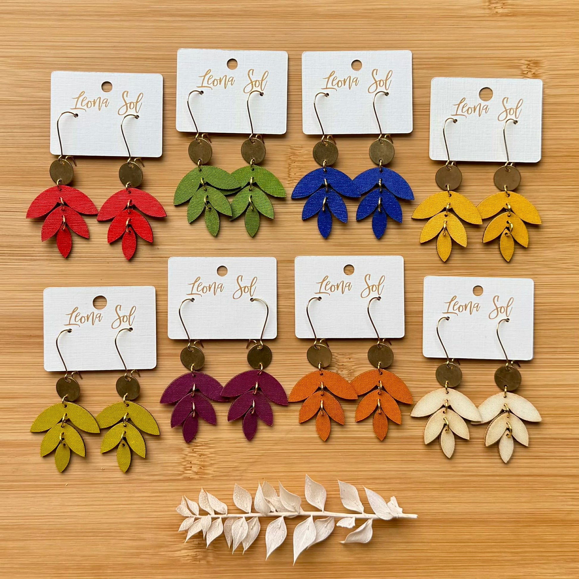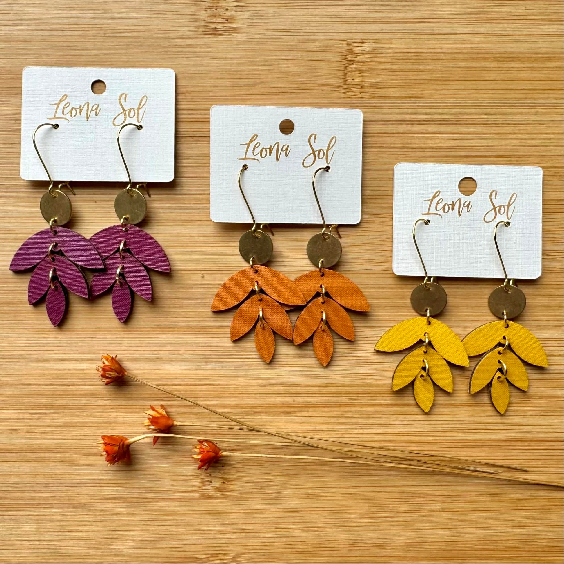 These sweet layered leaf earrings are the perfect dangle for casual or classy. They hang effortlessly from a drop ear wire that hooks in the back. These solid colors are great to go bold or soft and you won't feel them in as they are ultra lightweight.