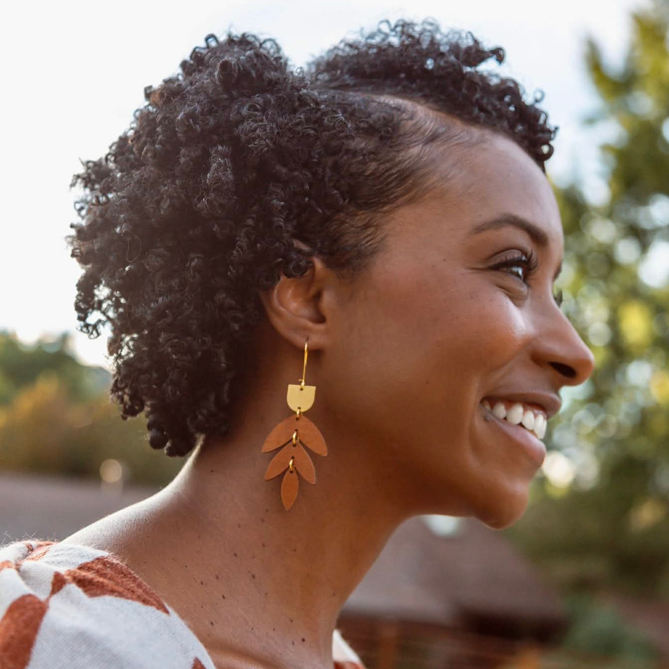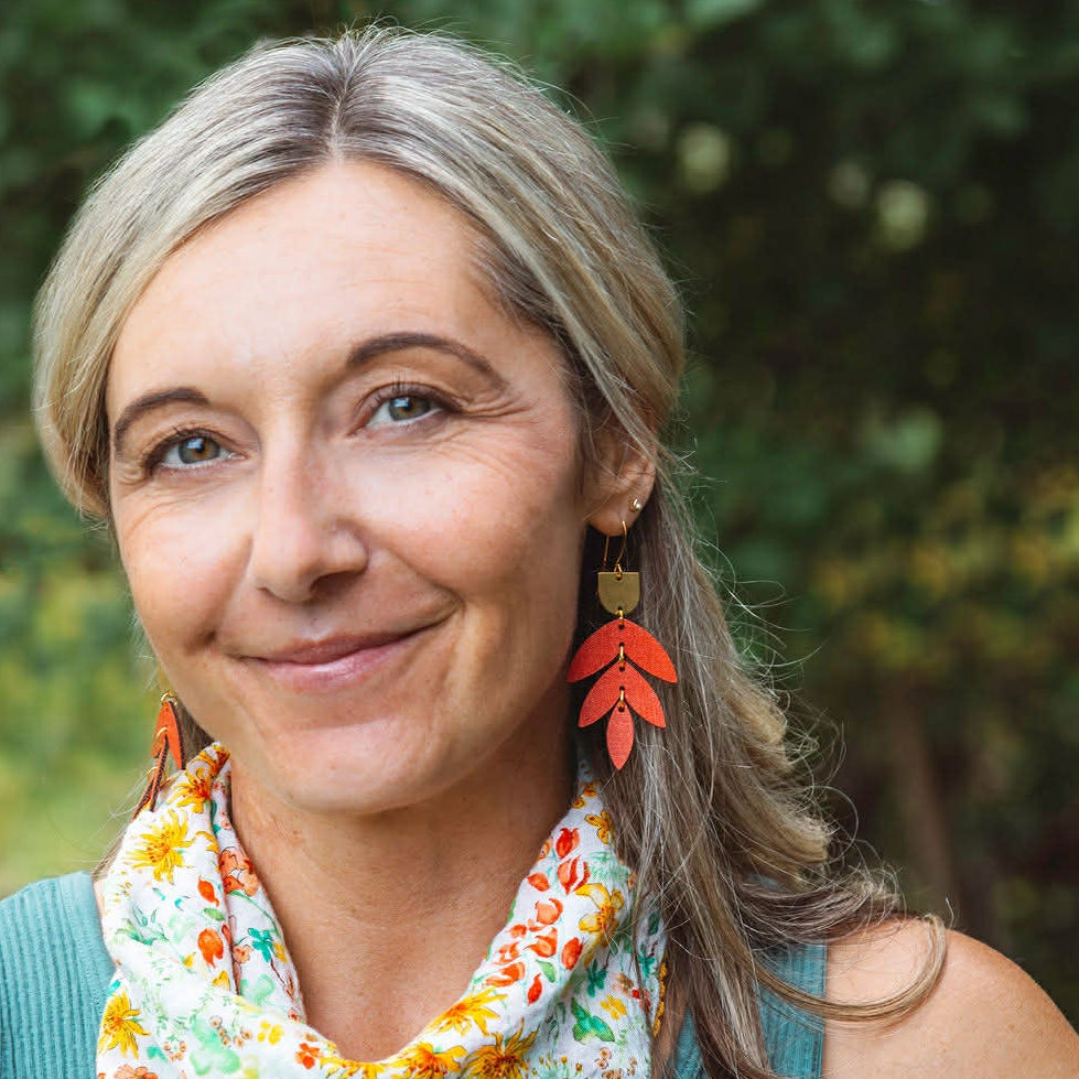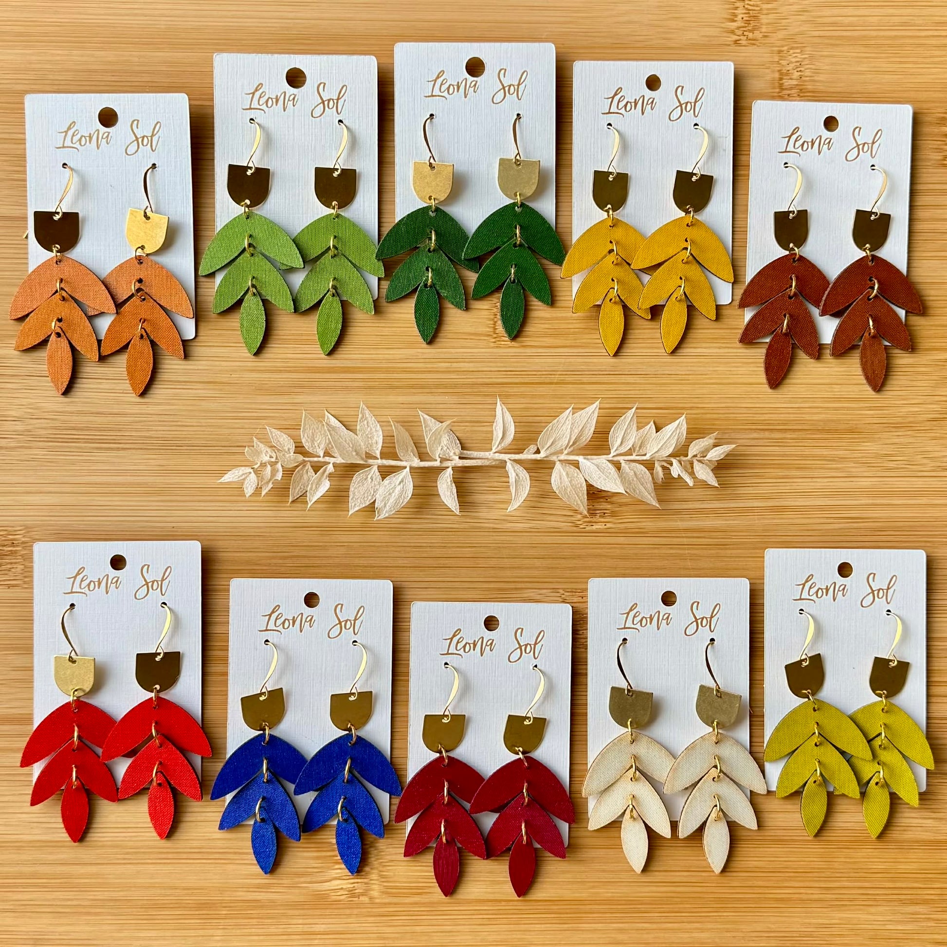 These stacked leaf earrings embody a beautiful and fierce style. Their solid bold color with a classy gold accent will elevate any vibe. Incredibly lightweight and handcrafted entirely from fabric. The ear wires are hypoallergenic and gold plated. All colors listed are placed in order on second photo.